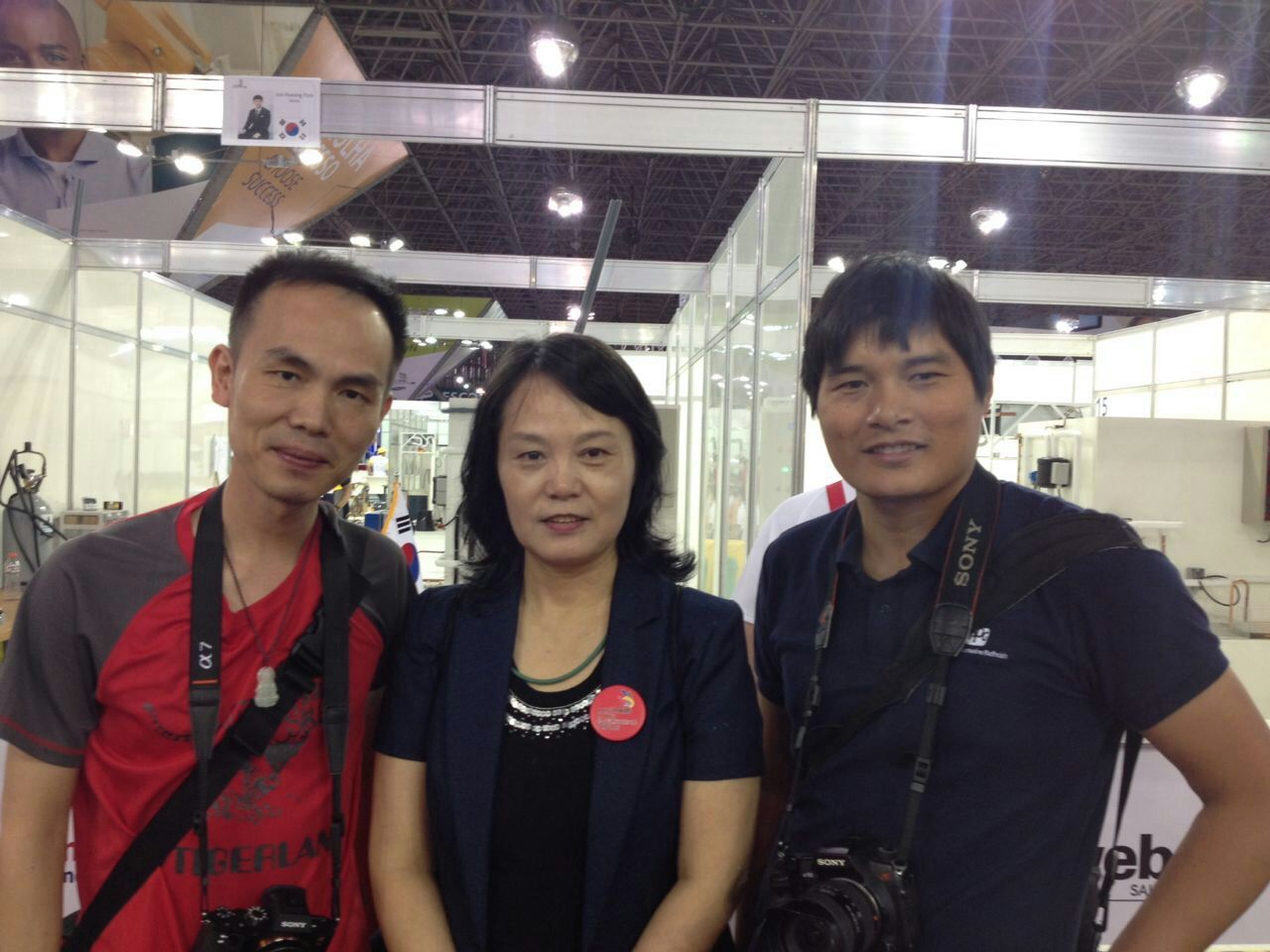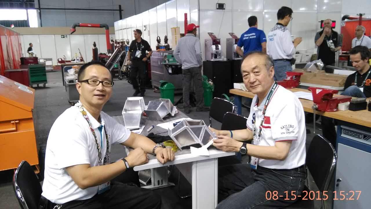 焊接项目中国专家张友权和技术翻译、世赛研究中心陈晓曦在工作中