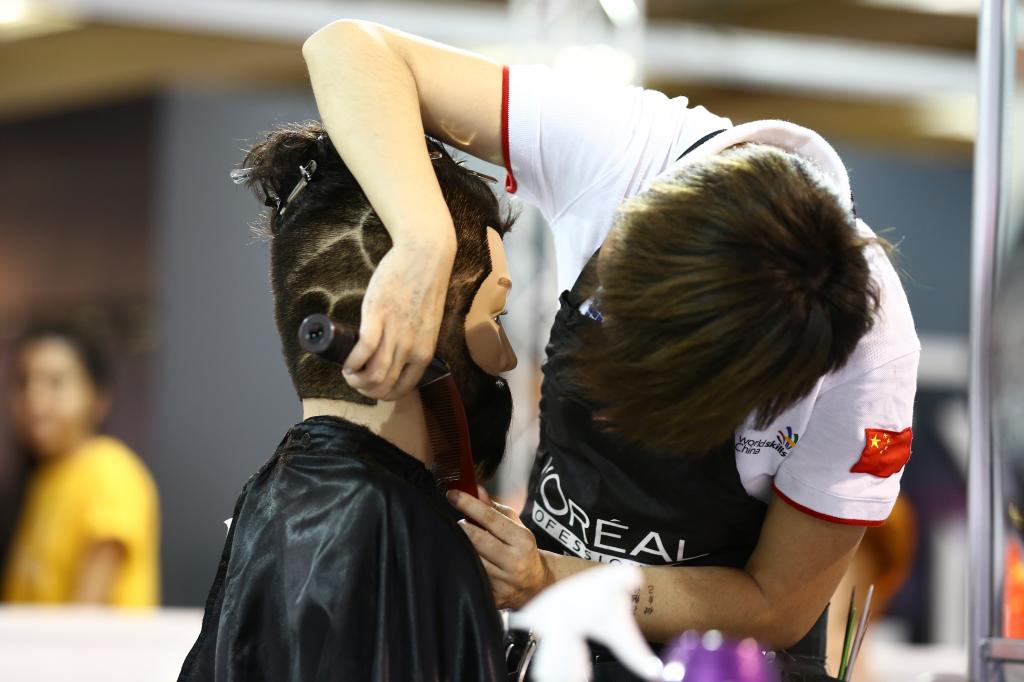 美发项目选手聂凤在比赛现场