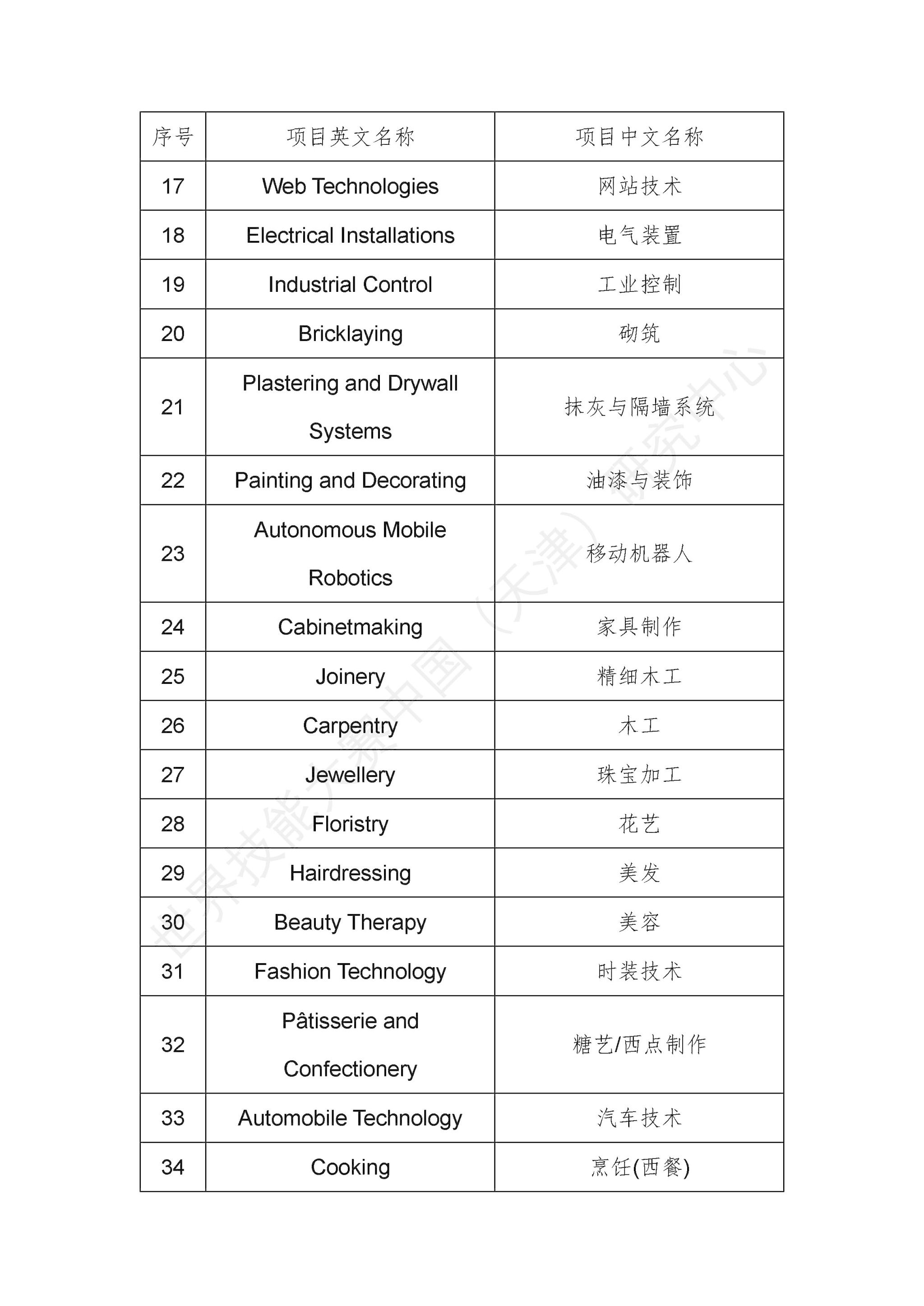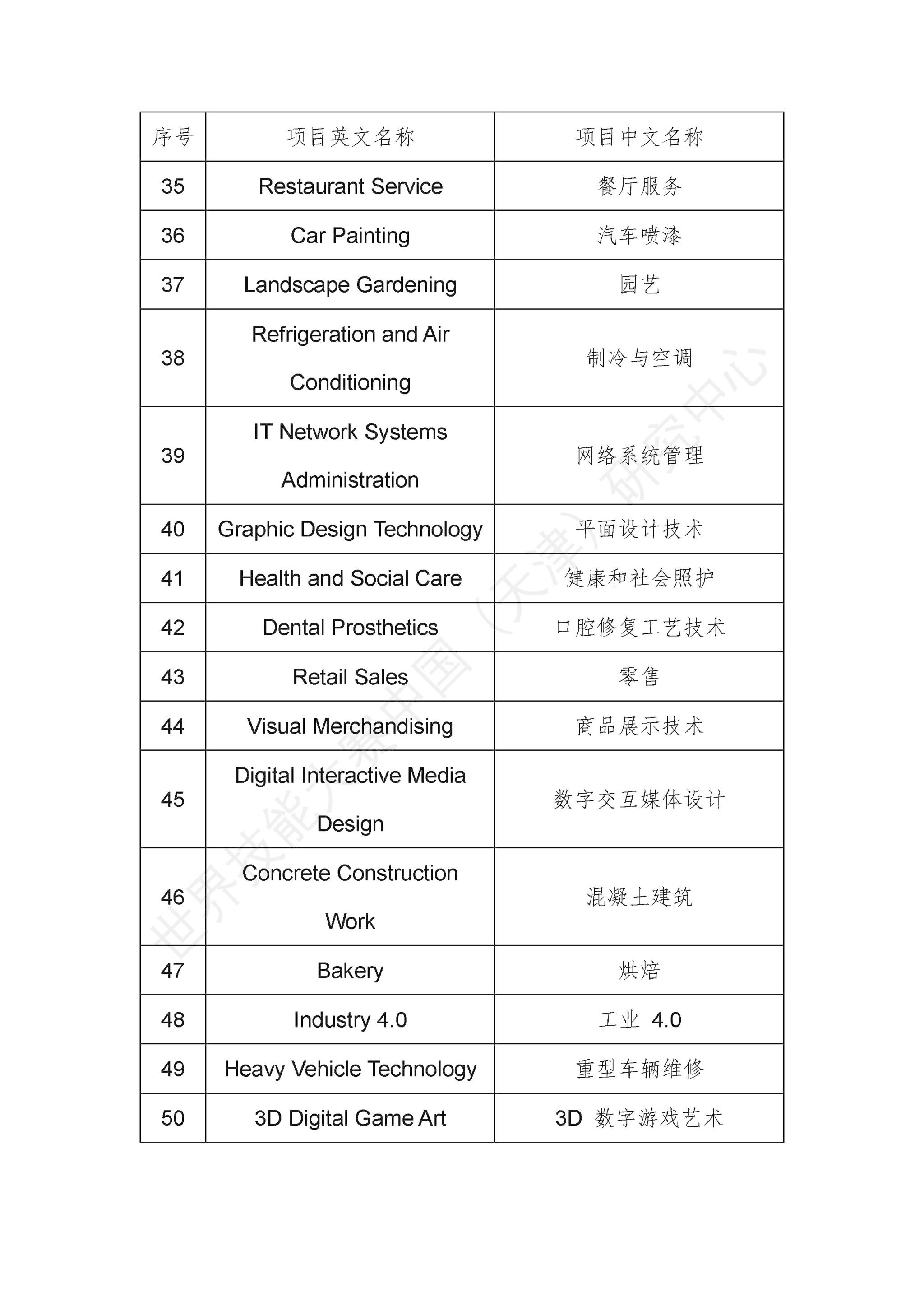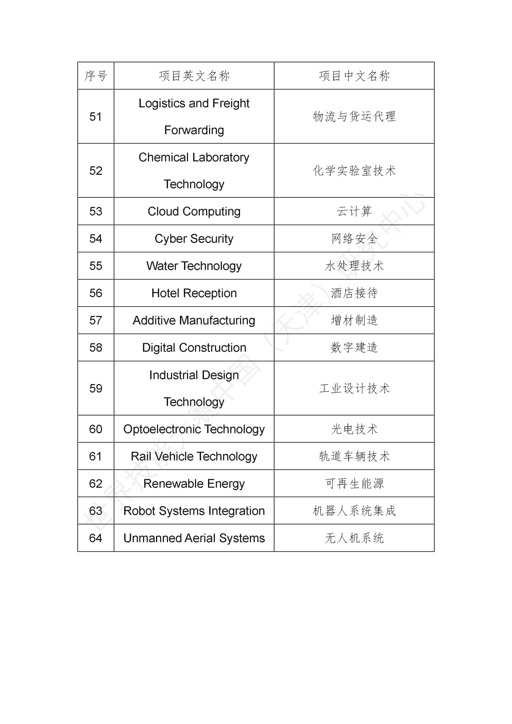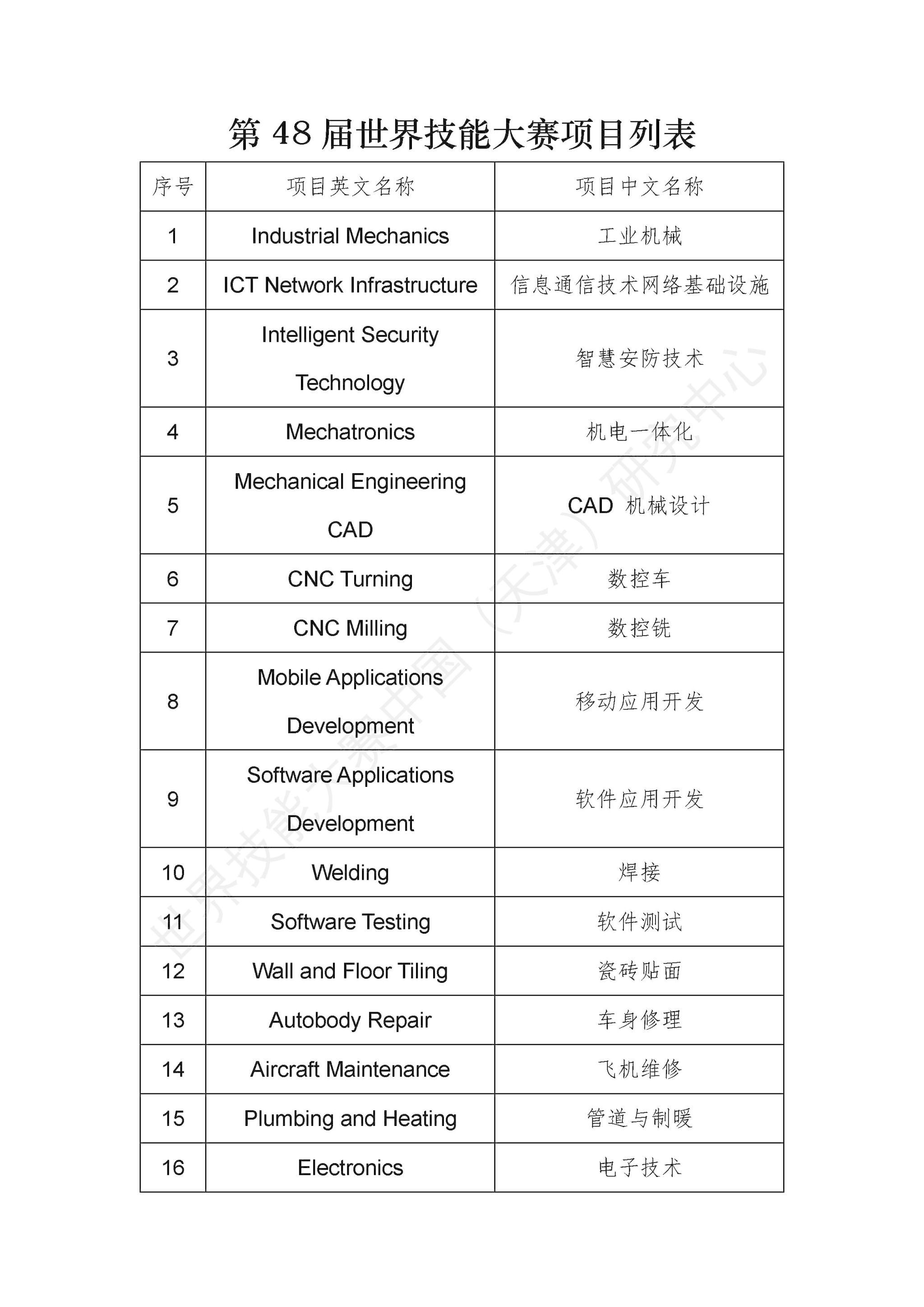 第48届世界技能大赛竞赛项目清单